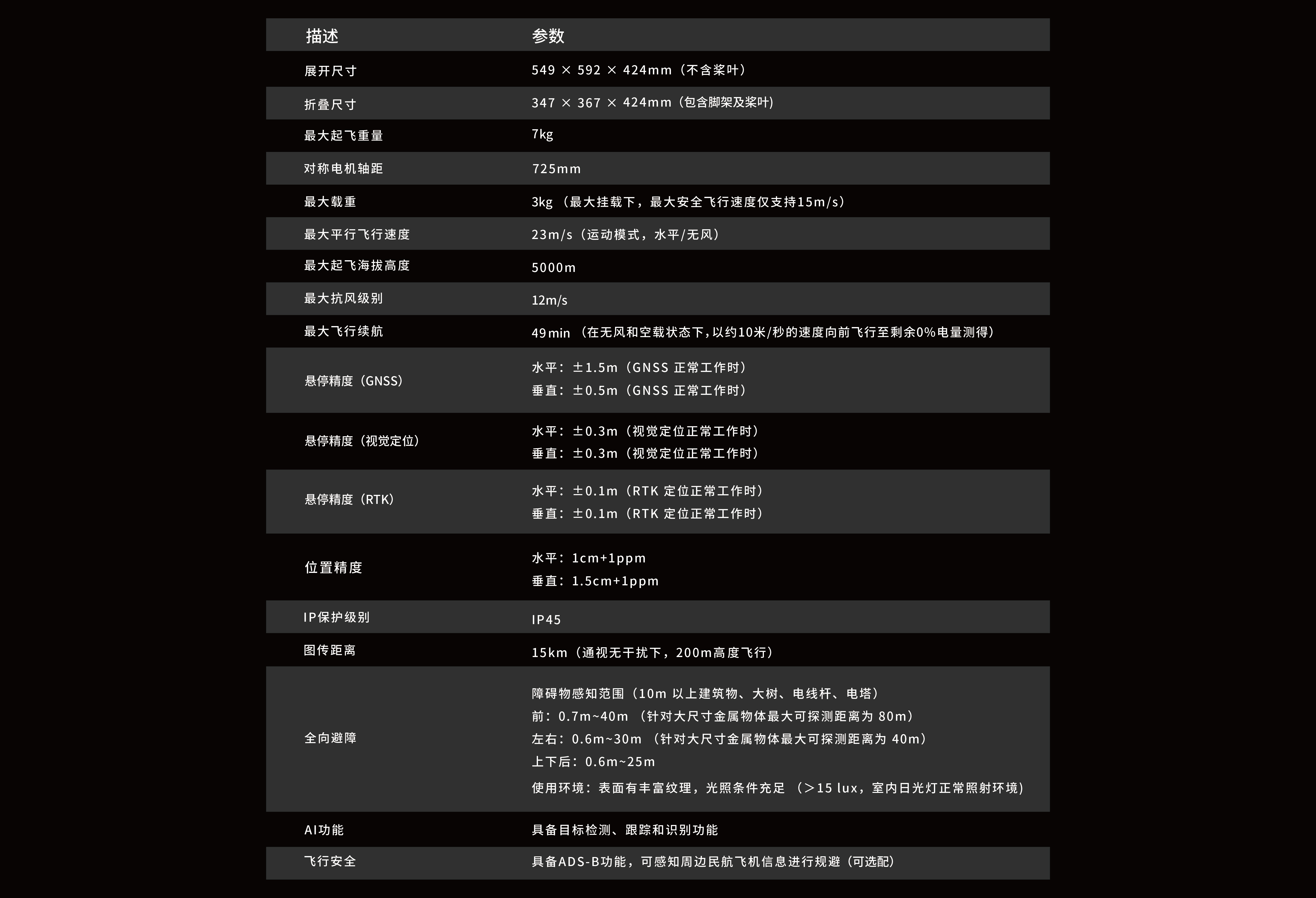 拥有三公斤的载重能力,可以同时搭载多种载荷以满足电力、消防、环保、智慧城市等不同行业的专业化作业需求。性能强悍的专业级飞机却能背包携行,精巧方便,利于野外作业。