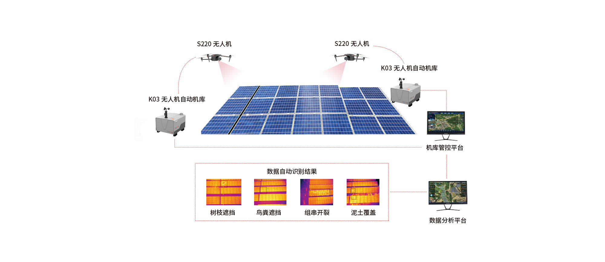基于无人机、无人机自动机库、智能管控平台、AI算法软件;实现光伏电站光伏组件、升压站、集电线路、送出线路等场景无人化自主巡检,