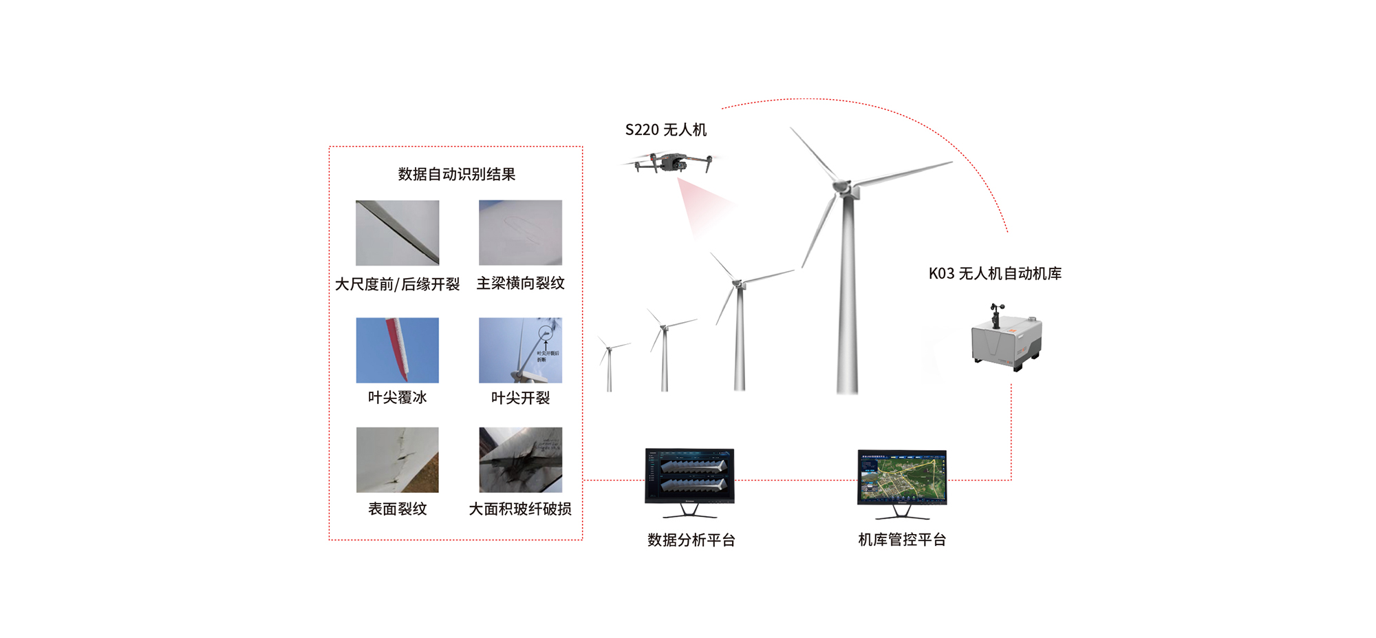 集无人机、自动机库、人工智能、图像处理等技术,全自动进行风机叶片、集电线路、升压站的巡检任务,