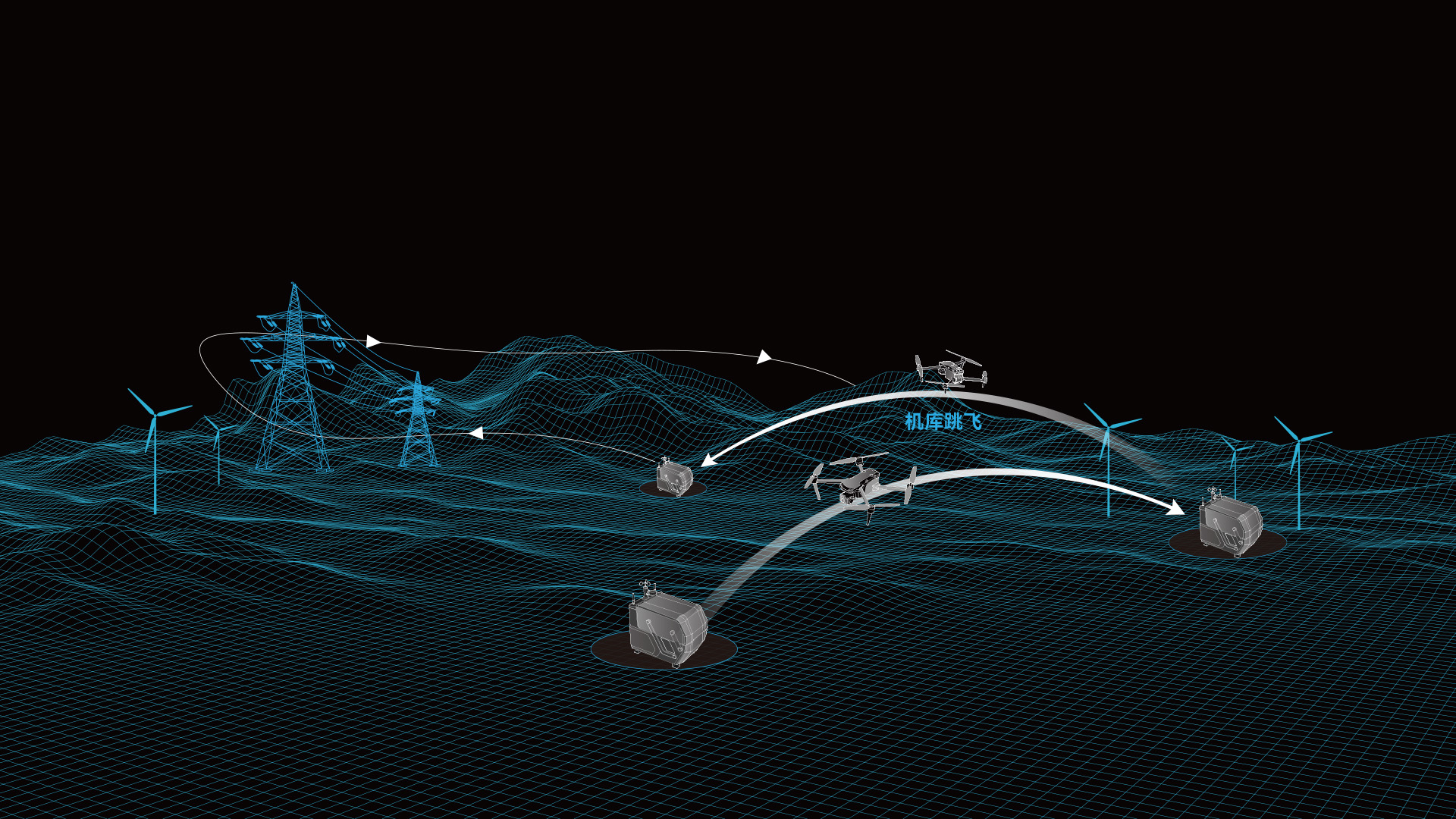 无人机在机库间连续跳飞作业,拓展作业范围,实现效率翻倍。