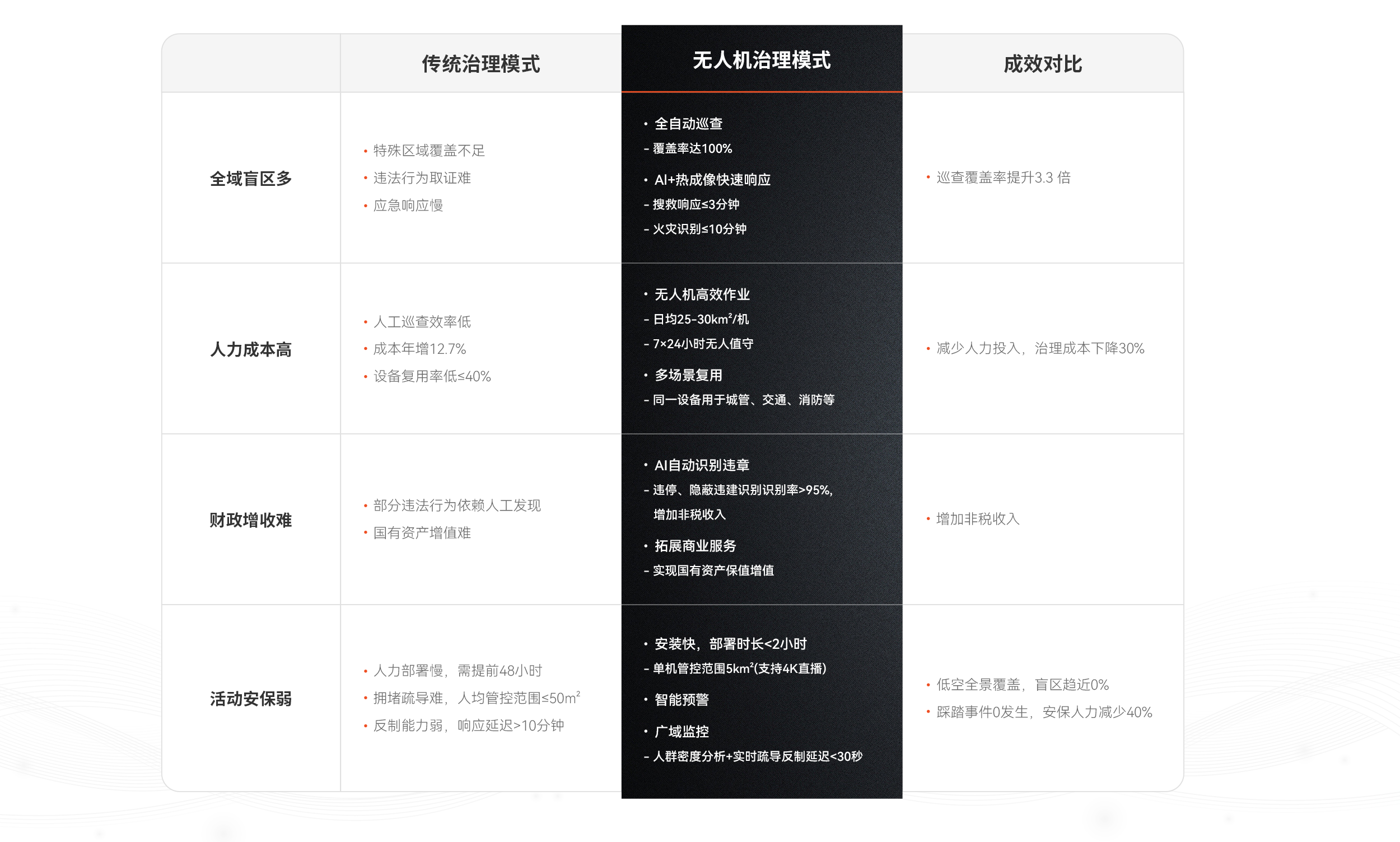 一次飞行任务即可赋能消防、交通、环境、城管、城建等多个业务部门,实现全天候无人值守,打造空天地一体化智慧城市。