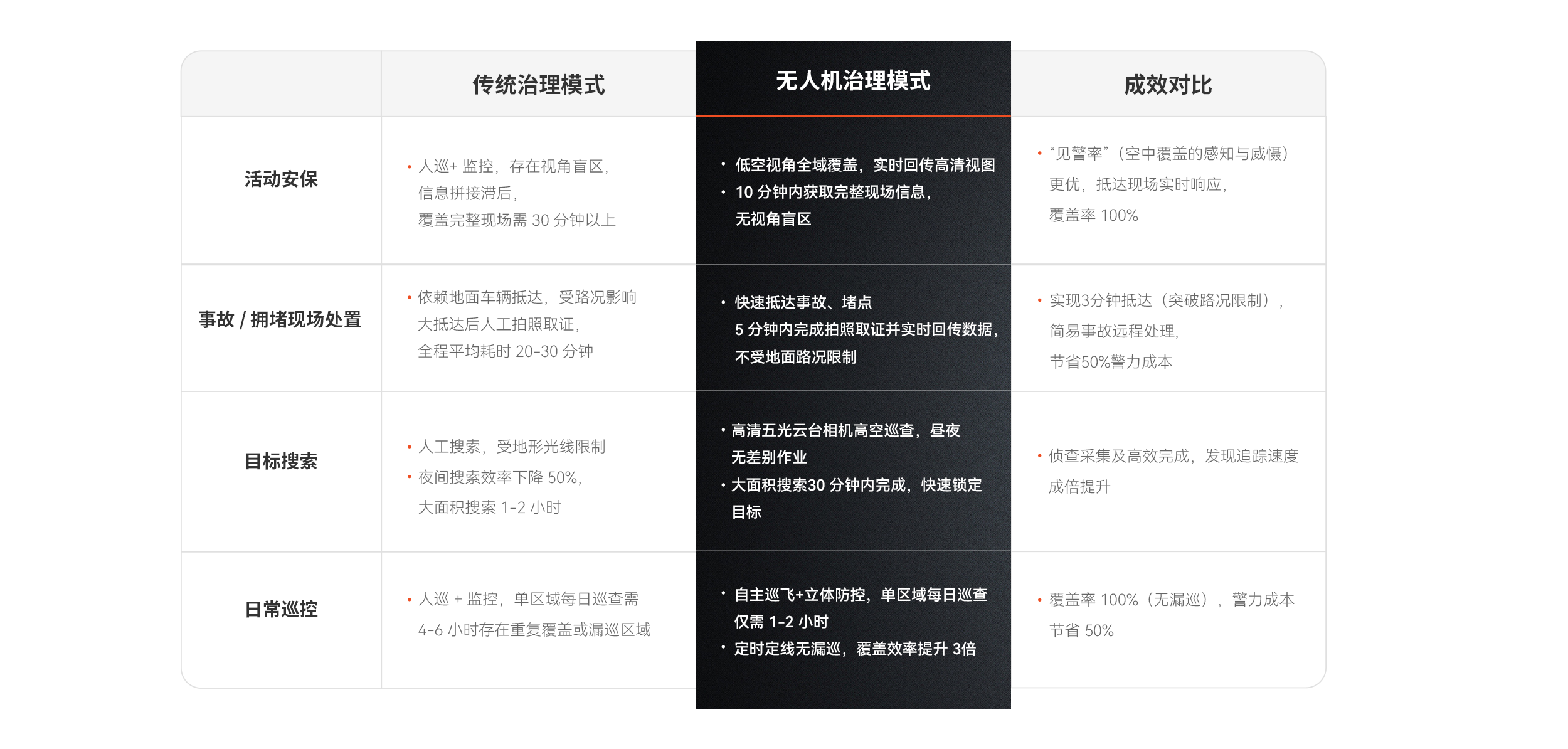 多作业场景 提效好帮手在城市管理、城市安全等新型智慧城市应用中,部署无人机自动机库装备,采用四旋翼无人机自主起降,